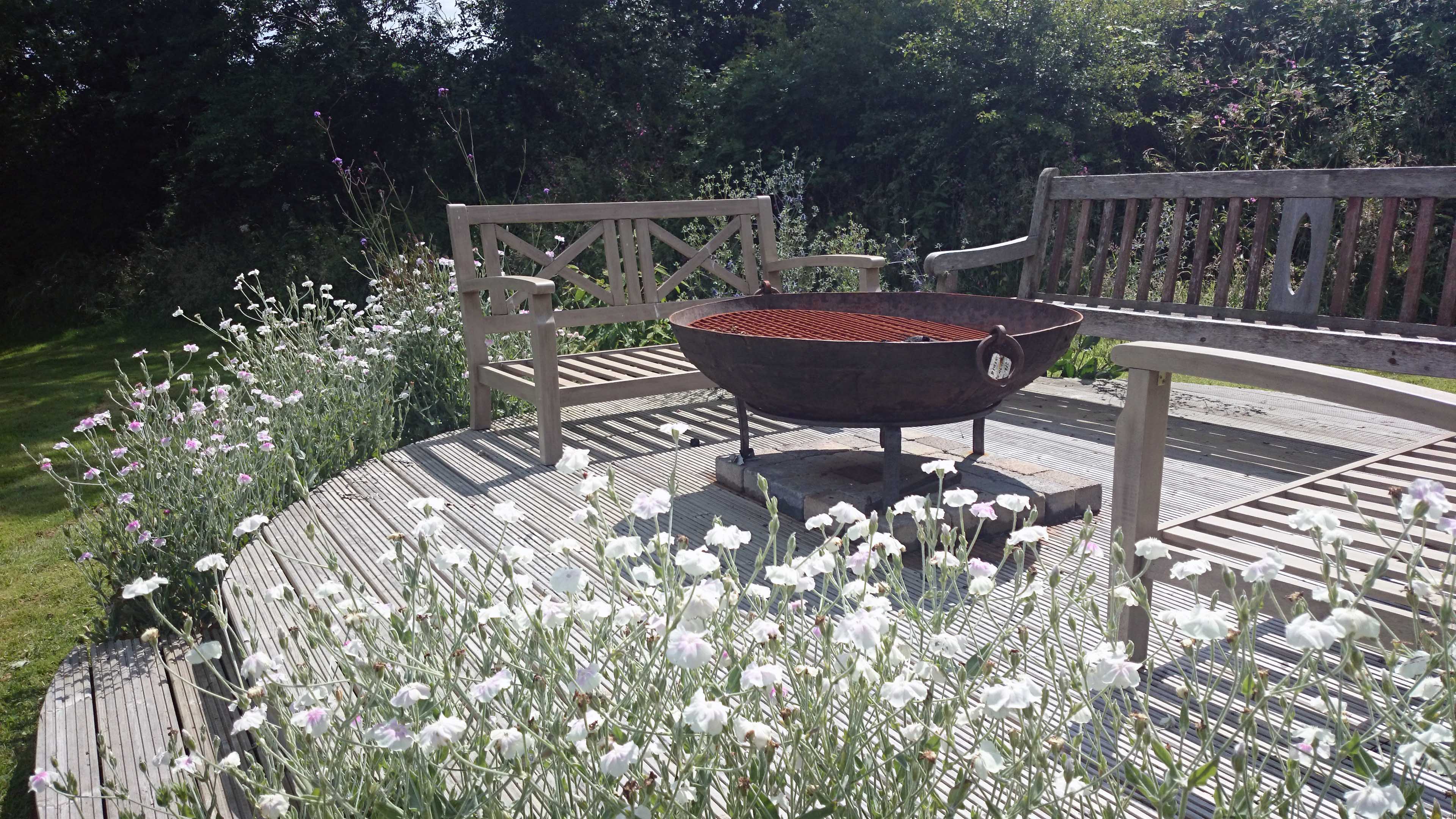 A raised deck at the top of the garden is a place to sit long into the night with the fire blazing.