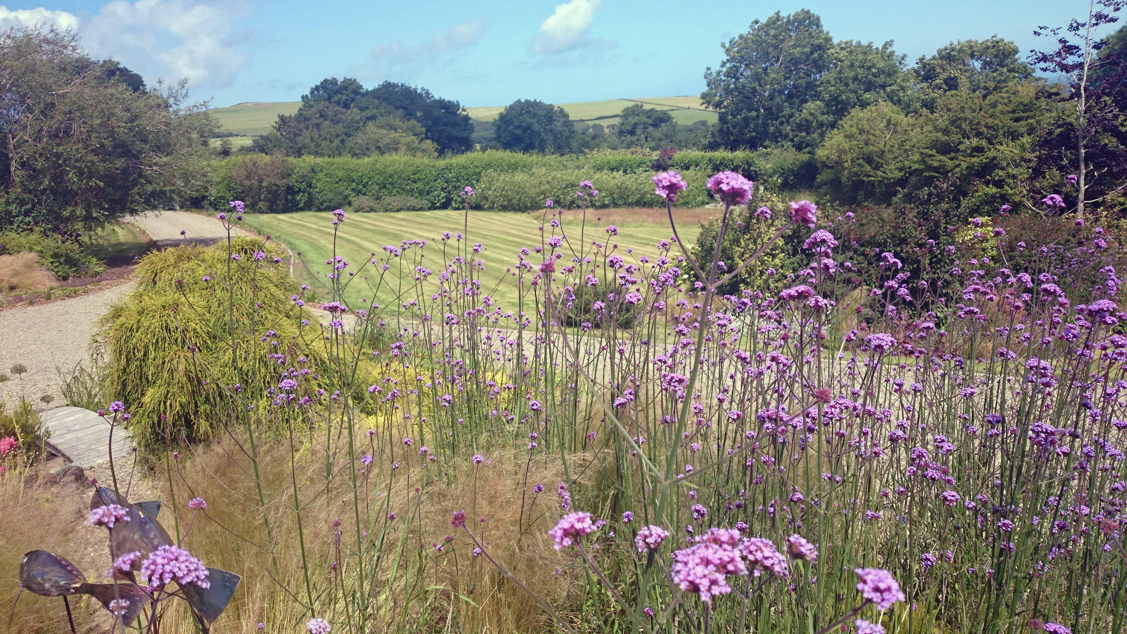 The eye is drawn down the garden from the front of the house to the wild flower meadow and sea views.