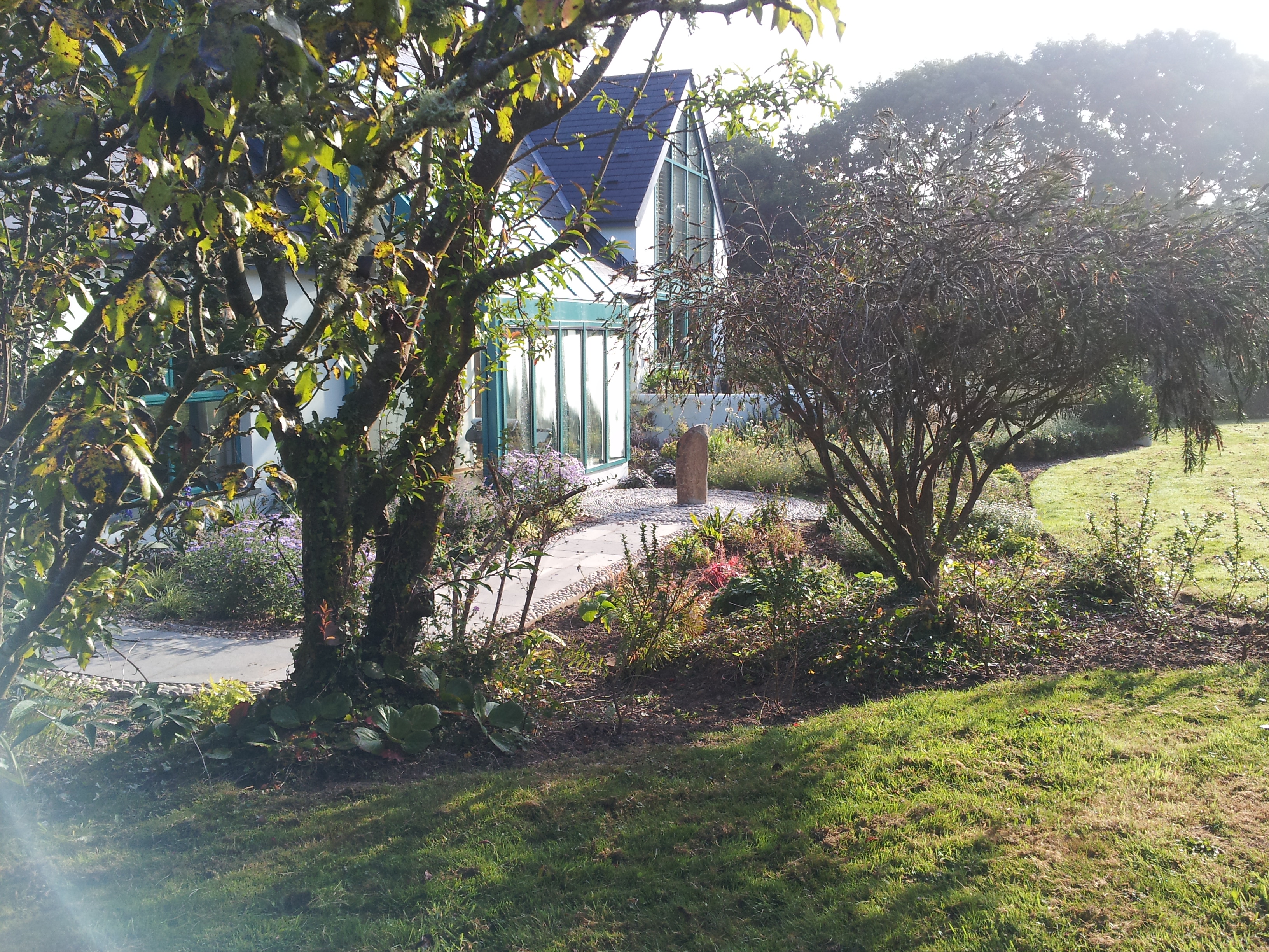 A standing stone, pebble mosaic and colourful planting give a great view from the conservatory.