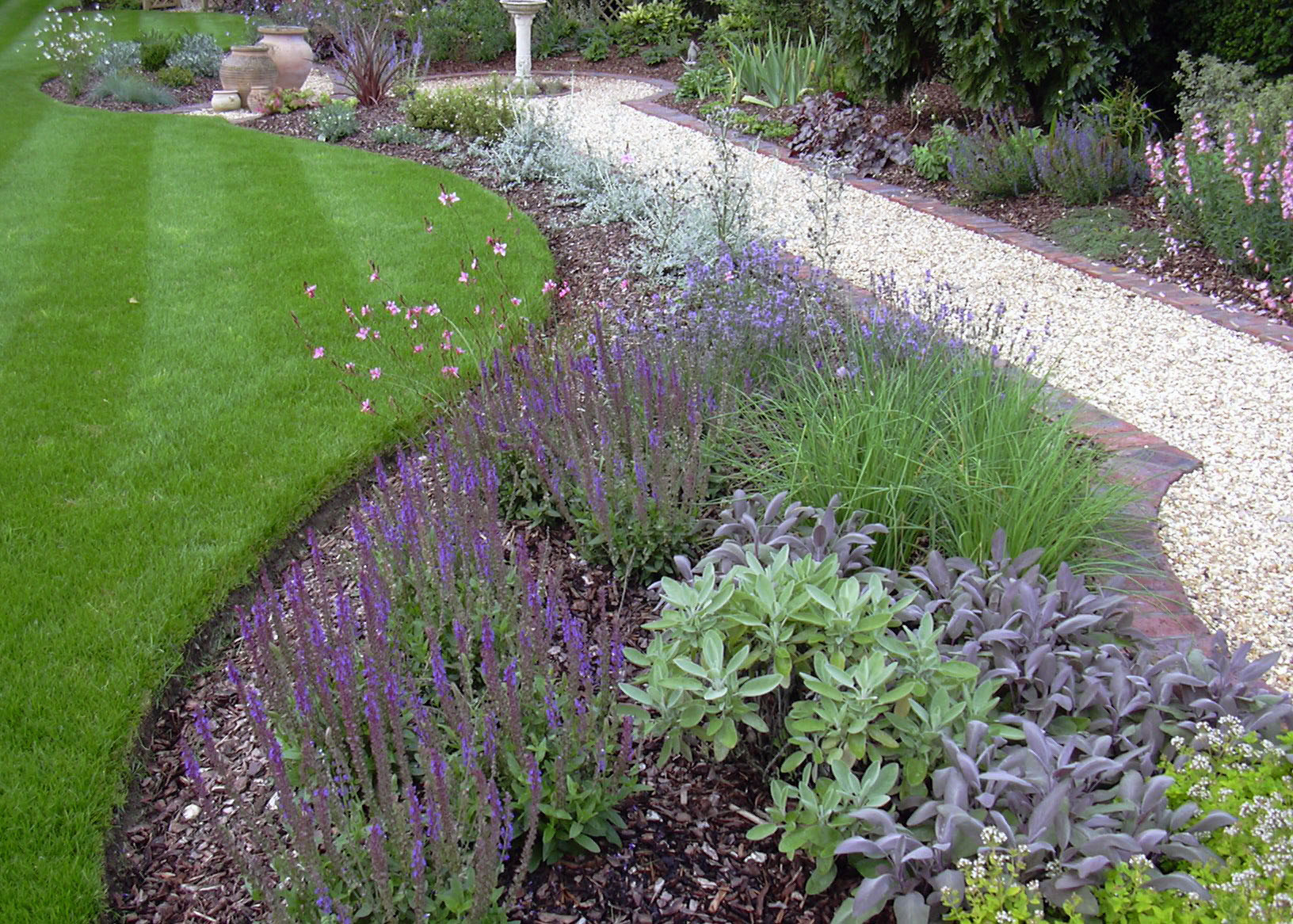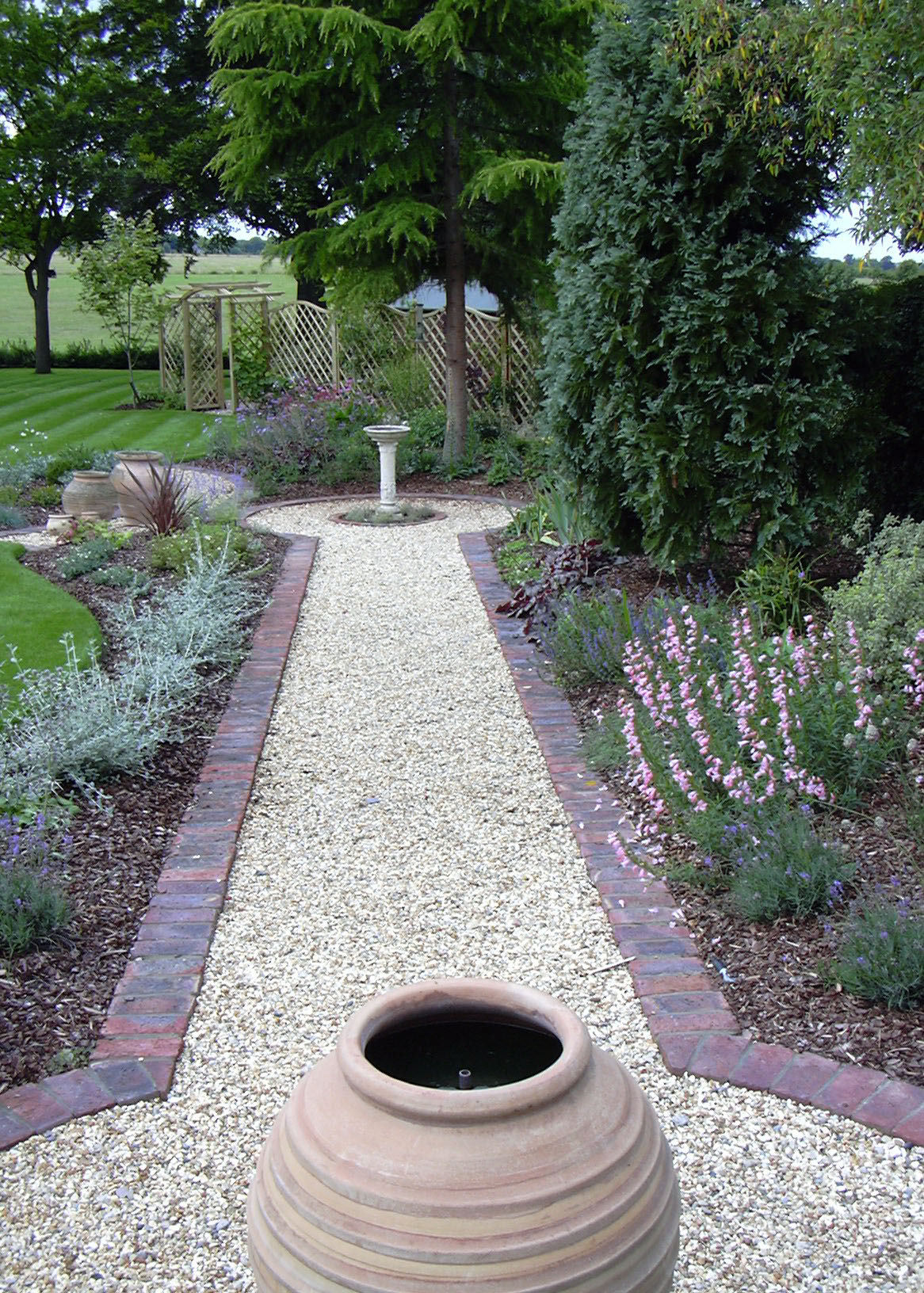 This simple path leads to a water feature past fragrant beds full of colour.